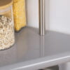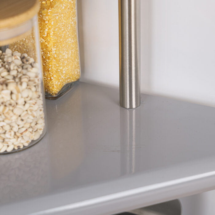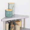 This Kitchen Corner Shelf is made with stainless steel. You can place spice bottles and dishes on the metal plate and use it as a spice rack or place it under the sink for your extra pots and pans.