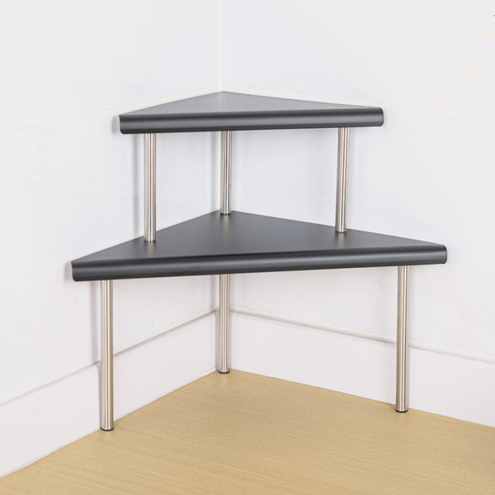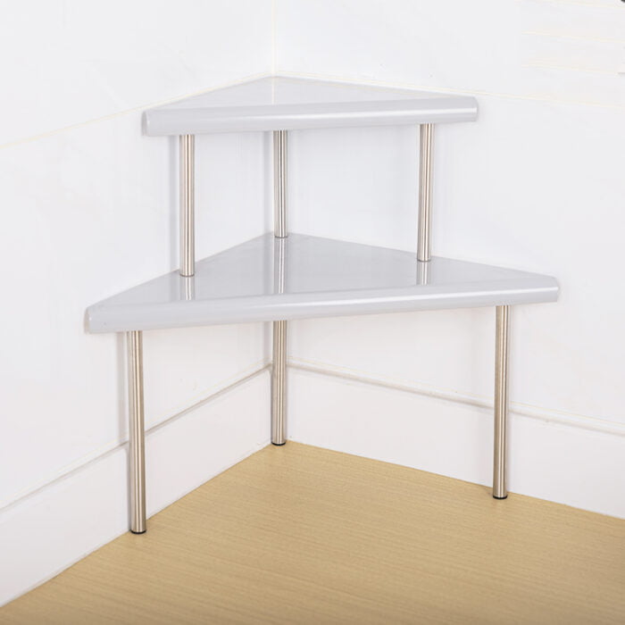This Kitchen Corner Shelf is made with stainless steel. You can place spice bottles and dishes on the metal plate and use it as a spice rack or place it under the sink for your extra pots and pans. It can be placed on any flat surface, such as table top or floor, saving space and making your kitchen cleaner and neater.