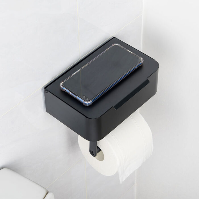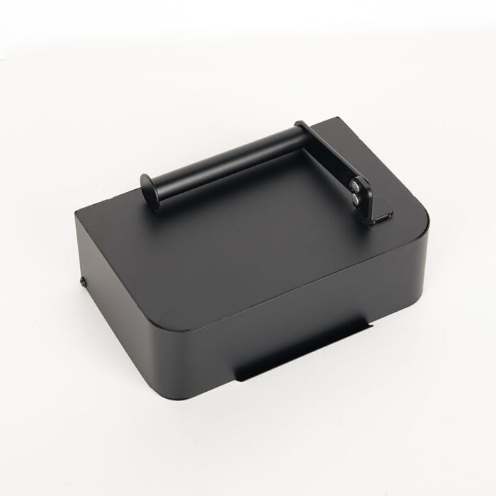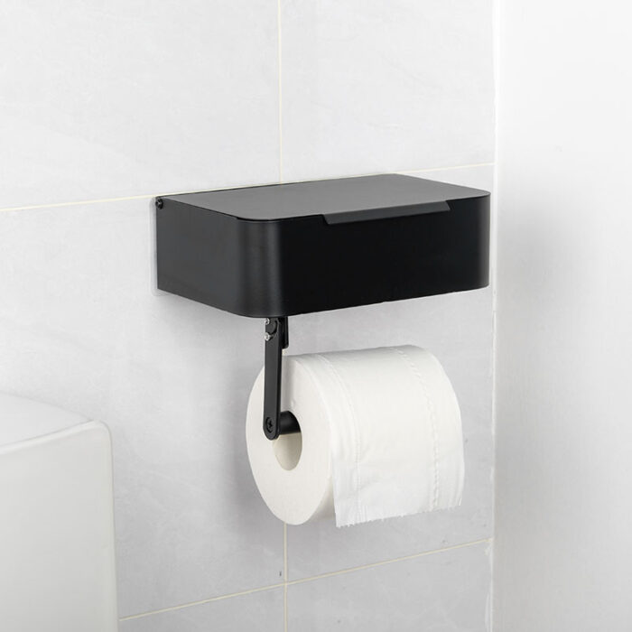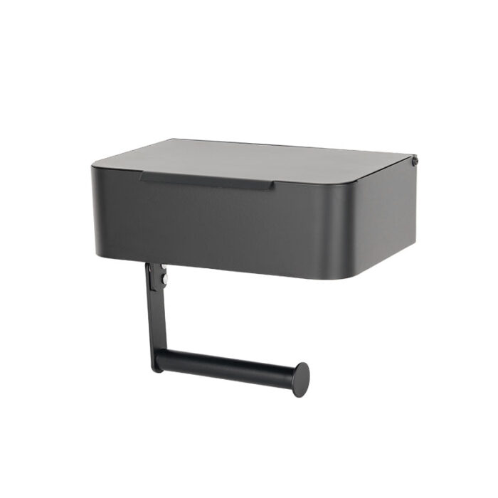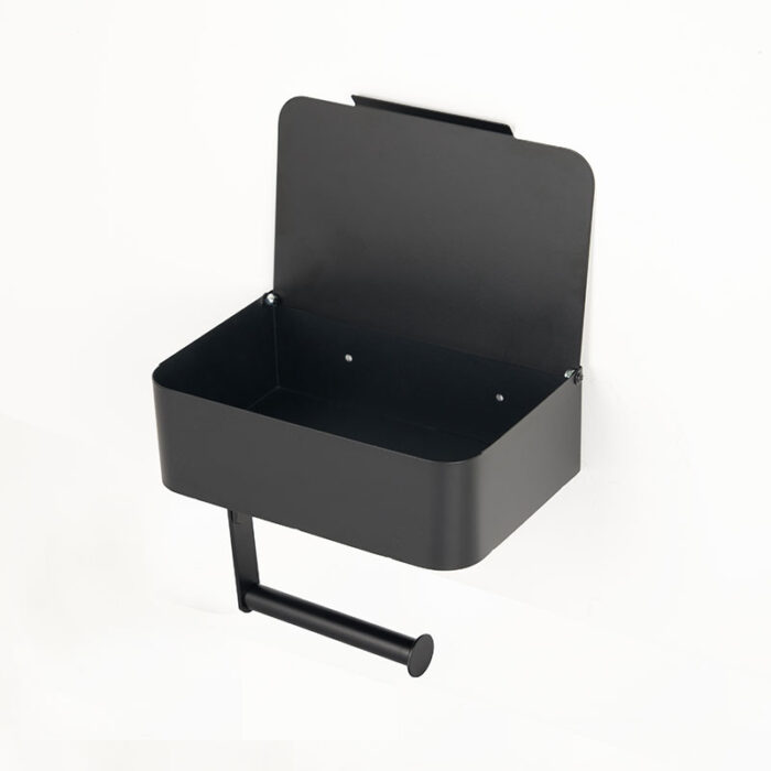 We are excited to introduce our newly developed product from the factory – a toilet paper towel holder with an integrated storage box. Designed for functionality and style, this innovative holder is made from high-quality metal and finished with black spray paint, offering not only durability but also a sleek look.
