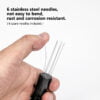 This WDT tool is equipped with 6 0.4 mm and 6 0.25 mm stainless steel needles with a magnetic holder and a maximum angle adjustment of 120°, so you can easily rotate the espresso dispensing tool according to your habits to achieve the ideal espresso needle stirring condition and better extraction of consistent coffee.