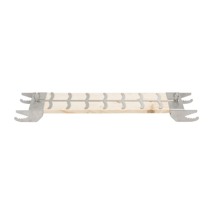 This product is a Stainless Steel Holder for Wooden Salmon Plank, comprising solely the metal components. It is customisable and has been adapted to accommodate wooden planks of various sizes.