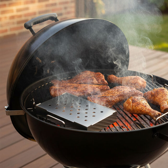 It’s easy to use: simply place your chosen wood chips or chunks into the box, close the lid, and then place it on the grill grate or directly on the charcoal. It efficiently controls the burning rate of the wood chips, producing continuous and stable smoke, and preventing direct flame contact with the wood chips from burning them out too quickly.